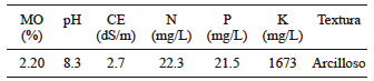 El estudio se inició en el ciclo otoño-invierno de 2014 en terrenos del Campo Experimental Río Bravo del Instituto Nacional de Investigaciones Forestales, Agrícolas y Pecuarias ubicado en Río Bravo, Tamaulipas (25º 57’ N, 98º 01’ O, 30 masl). Se tomaron muestras de suelo en presiembra de los primeros 30 cm de profundidad para analizar sus propiedades físicas y químicas (Cuadro I). El pH se determinó en solución acuosa (1:2), la conductividad eléctrica (CE) con el porcentaje de saturación, la materia orgánica (MO) se midió con dicromato de potasio, el N inorgánico (NO3-N) se determinó mediante ácido salicílico, el P disponible se midió con el método de Olsen y el K intercambiable con acetato de amonio (Plenecassange et al. 1999).