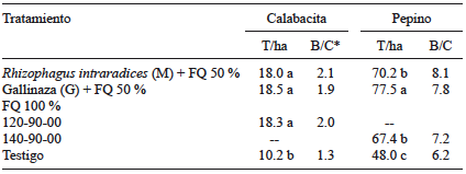 *Gallinaza: $1600/t; micorriza: $40/ha; FQ 100 % en calabacita: $5,795.77/ha; FQ 100 % en pepino: $6,091.13/ha; precio medio rural de calabacita y pepino: $4000/t. Letras diferentes indican diferencias significativas (p ≤ 0.05).