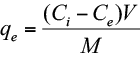 where qe is the adsorbed amounts of Cd(II) or Pb(II) (mg/g), Ci the initial metal concentration in the solution (mg/L), Ce the equilibrium metal concentration (mg/L), M the mass of the adsorbent used (g), and V the volume of the solute solution (L).