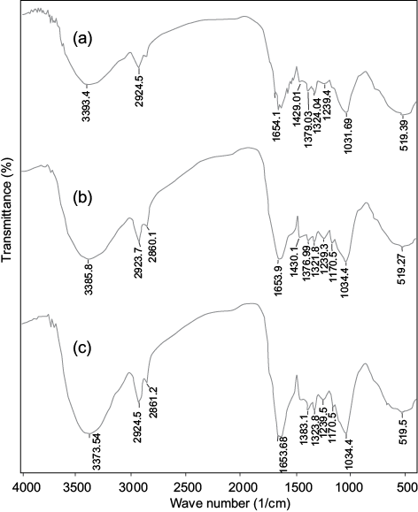 The cell wall of pistachio hull consists of lignin, hemicelluloses and cellulose that have different functional groups in their structure (Deniz and Kepekci 2016). The FTIR spectra of pistachio hull powder before and after Cd(II) and Pb(II) adsorption are presented in figure 1. The broad band around 3393 cm–1 in pure pistachio hull powder is attributed to stretching vibrations of hydroxyl (-OH) and amine (-NH2) groups (Moussavi and Barikbin 2010). This peak shifted from 3393 to 3385 cm–1 for Cd(II) and to 3373 cm–1 for Pb(II) and these bands became more intense after Cd(II) and Pb(II) adsorption onto pistachio hull waste. The peaks around 2920 and 2860 cm–1 may be assigned to C-H deforming vibration, and the sharp band centered around 1654 cm–1 can be related to the aromatic C=O ring stretching or C=C stretching vibration of aromatic groups (Moussavi and Barikbin 2010). These peaks were greatly intensified after adsorption of Cd(II) and Pb(II). The bands in 1300-1100 cm–1 can be attributed to stretching vibrations of C-O and C-H groups (Deniz and Kepekci 2016). After adsorption, a shift in the positions of the C-O and C-H group peaks occurred. This shift indicated that the Cd(II) and Pb(II) forms chemical bonds with these functional groups of the biosorbent. The sharp and intense peak at 1030 cm−1 can be assigned to the C-O-C, P-O or P-OH stretching (Deniz and Kepekci 2016) which shifted to 1034 cm−1 after adsorption of Cd(II) and Pb(II). The FTIR results show that the pistachio hull waste has a variety of functional groups, such as carboxyl, hydroxyl and amine, and these groups are likely involved in the biosorption of Cd(II) and Pb(II). Generally, biosorption of heavy metal ions onto biosorbents involves complex mechanisms of ion exchange, chelation (surface complexation), and adsorption by physical forces (Park et al. 2010, Fomina and Gadd 2014). Similar findings have been reported for sorption of Cd(II), Cu(II) and Pb(II) to Acacia leucocephala bark powder (Munagapati et al. 2010) and sorption of Cr(VI) to pistachio hull waste biomass (Moussavi and Barikbin 2010). Also, the FTIR spectrum of Pb-loaded pistachio hull waste was similar to that observed for Cd(II) (Fig. 1b, c).