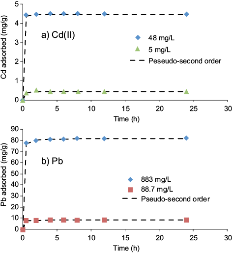 An increase in initial concentration of Cd(II) and Pb(II) leads to an increase in the adsorption capacity of pistachio hull biomass. As the initial metal concentration increased from 5 mg/L to 48 mg/L for Cd(II) and from 88.7 mg/L to 883 mg/L for Pb(II), the experimentally observed adsorption capacity (qexp) increased from 0.4 to 4.5 mg/g and from 8.1 to 82.2 mg/g for Cd(II) and Pb(II), respectively. Increasing initial metal concentration accelerates the diffusion of Cd(II) and Pb(II) from the solution onto the surface of the adsorbent due to the increasing driving force at higher metal concentrations (Hamidpour et al. 2011).