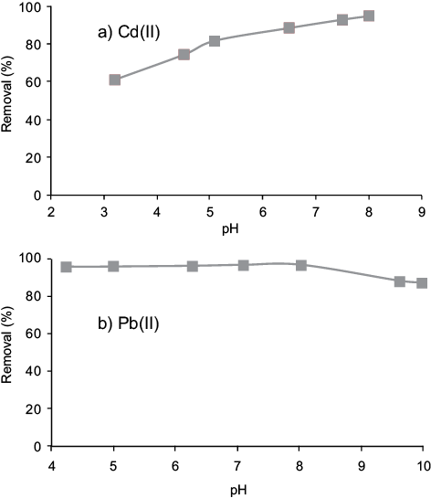 For Pb(II), two separate sections could be observed (Fig. 3b). Between pH 3.0 and pH 8.0, adsorption efficiency of pistachio hull slightly increased. In the second section (pH > 8) the adsorption efficiency decreased from 97 to 87 %.
