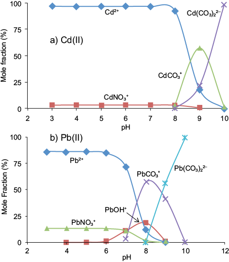 Chemical species of Cd(II) and Pb(II) in the solutions were also predicted using Visual MINTEQ, a computer code developed to simulate equilibrium processes in aqueous systems (Visual MINTEQ 2013).