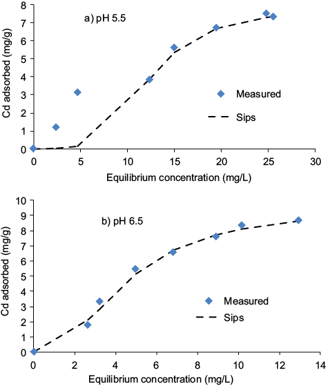 The analysis of the equilibrium adsorption data is important to develop a model which correctly describes the results and which could be used for design purposes. In this study, adsorption isotherms were fitted to the Freundlich, Langmuir and Sips equations using non-linear least-square analysis. Fitted models parameters, coefficients of determination (R2) and standard errors of estimate (SEE) for adsorption of Cd(II) and Pb(II) are shown in table IІІ. On comparison of SEEs and correlation coefficient values (R2), the Sips model correctly simulates the adsorption behavior of Cd(II) and Pb(II) onto pistachio hull (Figs. 5 and 6). This indicates that the adsorption process of Cd(II) and Pb(II) onto the adsorbent followed a combined Freundlich and Langmuir isotherm. The maximum adsorption capacities for the Sips isotherm increased from 84.6 to 92.4 mg/g and from 7.2 to 9.4 mg/g with an increase in the pH of the suspension from 5.5 to 6.5 for Pb(II) and Cd(II), respectively. The values of maximum adsorption capacities obtained using the Sips isotherm were very close to the experimental values.