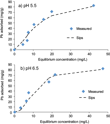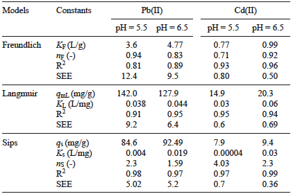 The Freundlich, Langmuir and Sips isotherms were used to fit the equilibrium data of Cd(II) and Pb(II) onto pistachio hull. Eqs. 5-7 represent non-linear form of Freundlich, Langmuir and Sips isotherms, respectively (Ho et al. 2002).