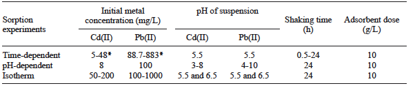 The effects of contact time (0-24 h), initial pH values (pHi 3-10), and initial metal concentration (50-200 mg/L for Cd[II] and 100-1000 mg/L for Pb[II]) on the adsorption process were investigated. The pH values of the suspensions were adjusted to desired values by adding predetermined volumes of 0.03 M HNO3 or NaOH solutions. The suspension pH was not adjusted during the experiment and the final pHs of suspensions were measured. Suspensions were shaken for 24 h with a rotary shaker at a speed of 150 rpm. After each adsorption experiment, the suspensions were centrifuged at 5000 g for 10 min, the supernatant filtered and Cd(II) and Pb(II) concentrations were determined by an AAnalyst Perkin-Elmer 200 Atomic Absorption Spectrophotometer (AAS). The operating conditions of the adsorption experiments are summarized in table I. The metal adsorption capacity of pistachio hull was calculated by the mass balance equation: