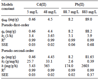 Table IІ shows the kinetic parameters of the pseudo-first-order and pseudo-second-order models obtained using the non-linear least-square analysis method. The results show that both models satisfactorily described the time-dependent Cd(II) and Pb(II) adsorption onto pistachio hull (R2 ≥ 0.99) and the experimental adsorption capacity (qexp) were close to that calculated from the these models (Table IІ). The fitness of experimental data to both the pseudo-first-order and pseudo-second-order kinetic models indicates that both physical and chemical interactions between the metals ions and pistachio hull biomass are necessary for the adsorption process. Good correlations of experimental data with the pseudo-first-order and pseudo-second-order kinetic models have been reported for the biosorption of Pb(II) and Cd(II) on Acacia leucocephala bark powder (Munagapati et al. 2010) and cork waste biomass (López-Mesas et al. 2011).