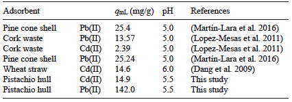 Several researchers have studied the adsorption capacity of biosorbents. However, the comparison of the pistachio hull biosorption capacity with other biosorbents reported in the literature is difficult because of the different experimental conditions (e.g., initial metal concentration, pH of the solution, temperature) applied in those studies. The adsorption capacity of pistachio hull for the removal of Cd(II) and Pb(II) has been compared with those of other biosorbents reported in literature (Table IV). The values were reported in the form of monolayer adsorption capacity. The experimental data of the present study show that the pistachio hull used in this study exhibited a reasonable adsorption capacity for Cd(II) and Pb(II), therefore, may be useful for removal of these metals from polluted environmental sites. Furthermore, the pistachio hull used in this study is a raw material (without modification) that can be easily obtained from pistachio processing industries in large amounts at no cost.