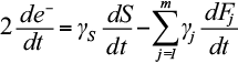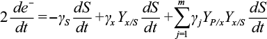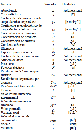donde el factor 2 del lado izquierdo se debe al factor doble z de la ecuación (1). El coeficiente γs estequiométrico indica la cantidad de carga eléctrica-mol por cada gramo por litro de fuente de carbono, mientras que γj indica la cantidad de carga eléctrica-mol por cada gramo por litro de compuesto químico (Cuadro I). El número total de compuestos químicos se denota por m. La ecuación (16) expresa la forma en que se transforman las cargas residuales susceptibles de ser utilizadas como corriente eléctrica debido al consumo de glucosa y a que algunos de los electrones forman parte de la biomasa y productos metabólicos.