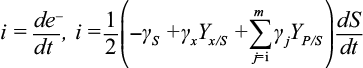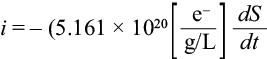 Por tal razón, hay una tasa de transformación de electrones de todas las cantidades presentes en la cámara anódica. Dichas razones se calculan al diferenciar en el tiempo la ecuación (1) y despejar la cantidad de cargas adheridas por unidad de tiempo en el ánodo, de acuerdo con:
