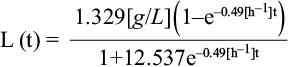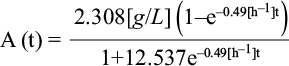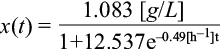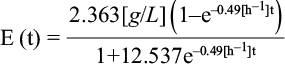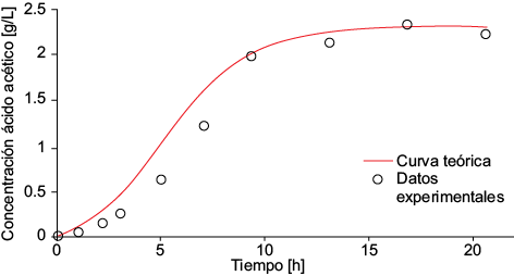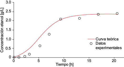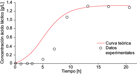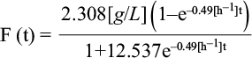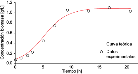 Se calculó la velocidad de crecimiento máxima en la fase exponencial para la parte lineal de los datos experimentales de biomasa (μmax = 0.49[h–1]). Al resolver analíticamente la ecuación (8) mediante la sustitución de la ecuación (9), utilizando la información de las concentraciones final (xmax = 1.083[g/L]) e inicial (xmax = 0.08[g/L]), así como la velocidad de crecimiento máxima, se obtuvo la solución para la concentración de biomasa como función del tiempo: