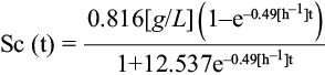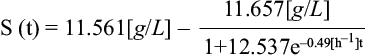 Con los datos experimentales de concentración de glucosa (sustrato) recabados se obtuvo el rendimiento microbiano (g-biomasa/g-sustrato), el cual arrojó un valor de YX/S = 0.092. Una vez obtenida, la solución en el tiempo para la concentración de biomasa (ecuación 19) se sustituyó en la ecuación (10) y se integró en dicha expresión para obtener la solución analítica al modelo de la concentración de glucosa.