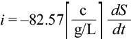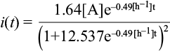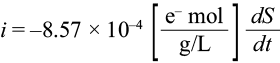 Para la ecuación anterior se calculó el término dS/dt de la ecuación (20), con el fin de obtener la corriente eléctrica teórica máxima generada por la actividad microbiana sin transitar por una resistencia externa, como función del tiempo. Al ser sustituida la derivada temporal de S(t), se obtuvo la siguiente expresión para la corriente: