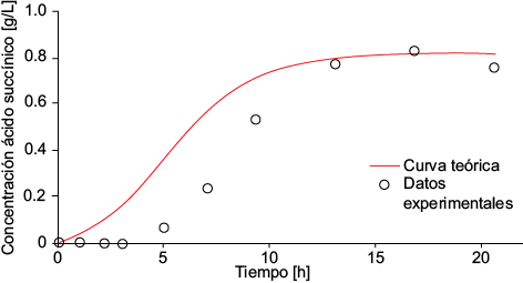 Con los datos experimentales de las curvas anteriores se calcularon los rendimientos de los productos metabólicos (cuadro II), así como los valores de los coeficientes de determinación de las soluciones analíticas con los puntos experimentales. Como se muestra en el cuadro II, los coeficientes de determinación son cercanos a 1, por lo que la ecuación logística modela el comportamiento microbiano del sistema. Sin embargo, el modelo diverge ligeramente en las primeras horas para los productos como ácido láctico y succínico, ya que el modelo arroja un aumento instantáneo en los productos como resultado del consumo de glucosa, pero en la realidad los productos anteriores se forman en etapas posteriores a la conversión de glucosa en ácido láctico y succínico. El modelo logístico no contempla que ocurran estos fenómenos. En el cuadro II se agrega la información expuesta también en el cuadro I, para sustituir los coeficientes estequiométricos en la ecuación (18).