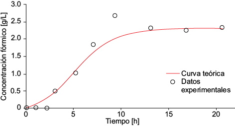 El cociente (xmax – x0)/x0 de la solución analítica corresponde al factor 12.537 de la ecuación (19). Los puntos experimentales de biomasa y la solución analítica se grafican en la figura 6.