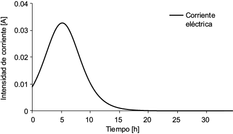 En la figura 13 se muestra la intensidad de corriente eléctrica teórica generada por la actividad microbiana susceptible de convertirse en corriente medible en una resistencia externa. Se observa y calcula que el valor máximo que ofrecería el sistema es de 31 mA. Si la CCM operara en modo continuo, se produciría como cota superior ix = 31 mA.