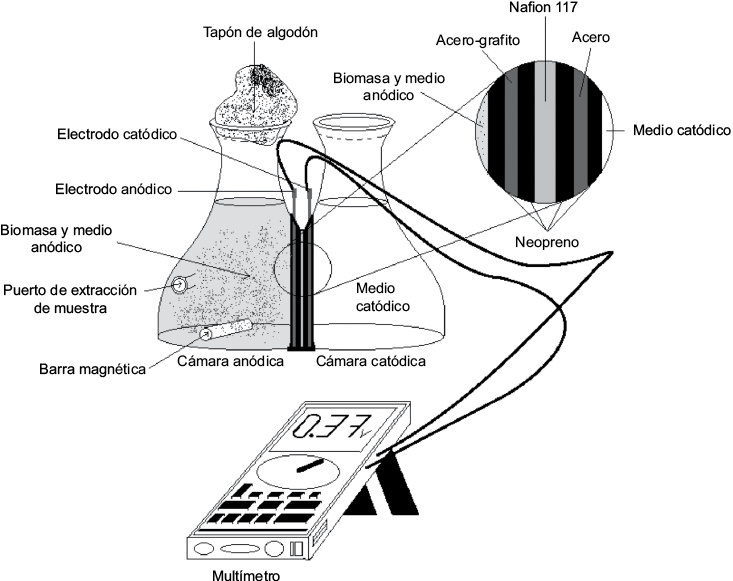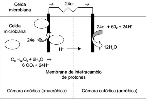 Las celdas de combustible microbiana (CCM) producen energía eléctrica a través de la oxidación de compuestos orgánicos mediante microorganismos. La arquitectura de una celda de combustible en general consta de dos cámaras: la cámara anódica, donde se encuentran los microorganismos, y el medio de cultivo, junto con un electrodo embebido en el medio que funge como aceptor de electrones fijo (ánodo). Los electrones fluyen del ánodo al cátodo a través de un circuito eléctrico externo (Lovley 2006, Ahn y Logan 2012). Una membrana selectiva de protones permite su flujo de la cámara anódica a la cámara catódica. Se coloca una resistencia externa a las cámaras para permitir el flujo de electrones convertidos por los microorganismos del electrodo anódico al catódico, mientras que en la cámara catódica se lleva a cabo la reacción de reducción de oxígeno debida a los protones que fluyeron por la membrana intercambiadora de protones (Fig. 1) (Rabaey et al. 2003, Logan et al. 2005).