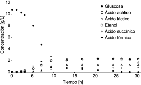 En la figura 3 se observa el crecimiento debido al consumo de glucosa por E. coli y la formación de productos metabólicos, principalmente ácidos acético, láctico, succínico y fórmico, así como etanol, ya que los otros productos aparecen a nivel de trazas.