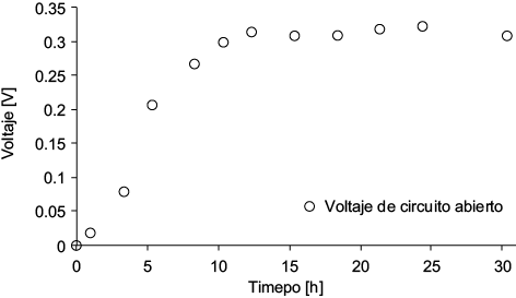 El voltaje a circuito abierto se midió en los bornes de la cámara anódica y catódica, mostrando estabilidad después de 14 h. En la figura 4 se muestran los valores de voltaje en el tiempo.