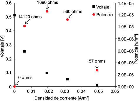 Se calculó la potencia por unidad de volumen (P = (V × i)/v)). La figura 5 muestra, en el sentido de las manecillas del reloj, los puntos de voltaje y densidad de potencia para las resistencias respectivas como 0, 14 120, 1690, 560 y 57 Ω. Después se observó que la corriente que entrega la máxima potencia de la CCM correspondió a una resistencia de 1690 Ω. Debido a que el propósito de un sistema energético es que proporcione la máxima potencia posible, se llevó a cabo la medición de corriente para una carga externa de 1690 Ω. Se midió la corriente eléctrica inmediatamente después de alcanzar el máximo voltaje a las 14 h de operación, obteniéndose un valor de 0.057 mA, en tanto que la densidad de corriente para esta resistencia fue de 0.02 mA/m2. La densidad de corriente es muy baja al compararse con otras CCM (0.058 A/m2 [Reiche y Kirkwood 2012], 0.073 A/m2 en [Rodrigo et al. 2009] y hasta 8.2 A/m2 [Logan et al. 2007]). La diferencia fundamental radica en que en dichas CCM los organismos eran puramente electrogénicos, por lo que el aceptor de electrones era un metal, mientras que en el caso de E. coli se trata de ácidos orgánicos. Es importante mencionar que Reiche y Kirkwood (2012) utilizaron una alta concentración de fuente de carbono (19 g/L glicerol) distinta a la empleada en el presente trabajo.