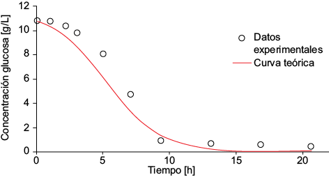 Los datos experimentales de concentración de glucosa y la gráfica de la ecuación (14) se muestran en la figura 7.