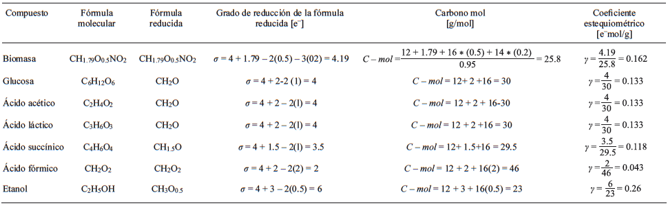 Si se opera por lote una CCM, entonces se cuenta con un límite de electrones que pueden convertirse en electricidad en una CCM en condiciones anaeróbicas, si los productos metabólicos predominantes son los mencionados. El cuadro I muestra los grados de reducción de las variables dinámicas de algunos compuestos tipo para la ecuación 1.