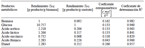 Cuando E. coli crece con glucosa en condiciones anaeróbicas se forman biomasa y compuestos de la fermentación ácida mixta de acuerdo con la ecuación 1 (Rittman y McCarty 2001),