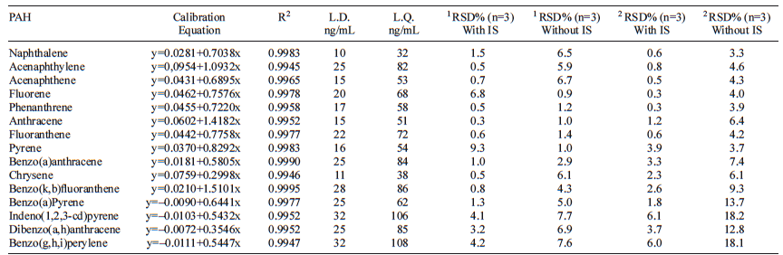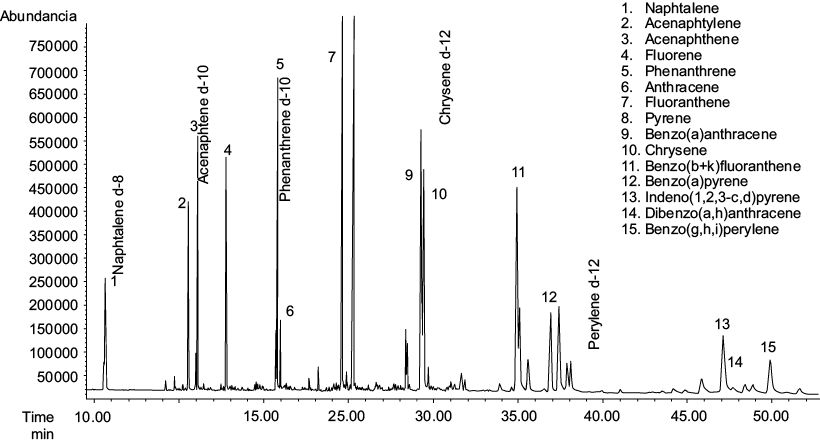 By using a standard sample of PAHs containing the 16 USEPA pollutants, chromatographic separation was carried out with the internal standard (IS) technique in order to correct any possible instrumental drift. The deuterated homologous of PAHs (naftalene-d8, acenaphtene-d10, phenantrene-d10, chrysene-d12, and perylene-d12) were used as IS. These compounds are not present in real samples, and they have physical and chemical properties similar to those analytes providing interference-free GC-MS signals.