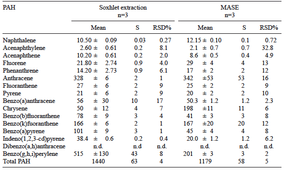 Table VIII shows the certified values for different PAHs with their confidence limits; concentrations (mg/kg) of the pollutants obtained by the MASE and Soxhlet extraction methodologies; and recovery values for the different PAHs with final determination by GC-MS. In both cases, MASE and Soxhlet, we found that our values fall into the confidence limits established for the reference material. However, the recovery values obtained for PAHs turned out to be higher than those obtained with MASE (anomalous values were observed for fluoranthene (–147 %) and benzo(g,h)perylene (–124 %). Nevertheless, once clean extracts were obtained for the analysis by GC-MS, it was necessary to handle the extracts at three dilution levels: (1 preconcentrate:1 hexane) dilution for naphthalene, acenaphthylene, acenaphthene, fluorene, and dibenzo(a,h)anthracene determination; (1 preconcentrate:10 hexane) dilution for phenanthrene, anthracene, pyrene, venzo(a)anthracene, indene(1,2,3-cd)pyrene, and venzo(g,h,i)perylene determination; and (1 preconcentrate:50 hexane) dilution for fluorantene, chrysene, venzo(b,k)fluorantene, and venzo(a)pyrene determination. The necessary dilutions are the main drawback of the GC-MS determination, but they are necessary following both PAHs extraction methods.