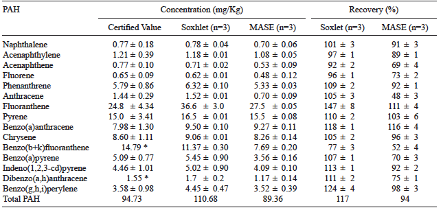 In order to validate the proposed method, the new set-up was used to extract PAHs from the CRM 104-100 soil. The reference material came from Elisabeth River in the Chesapeake Bay, VA, USA, containing 16 PAHs (the values for benzo(k,b)fluoranthene and dibenzo(a,h)anthracene are only recommended). These two compounds of the reference material were extracted by both MASE and Soxhlet techniques.