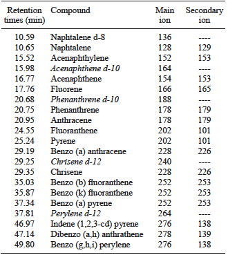 Table I shows retention times of the main and secondary ions of PAH and internal standards monitored, selected for each ion.
