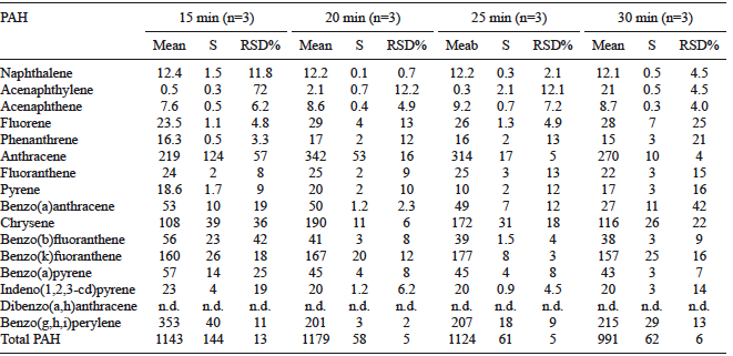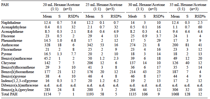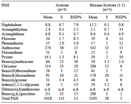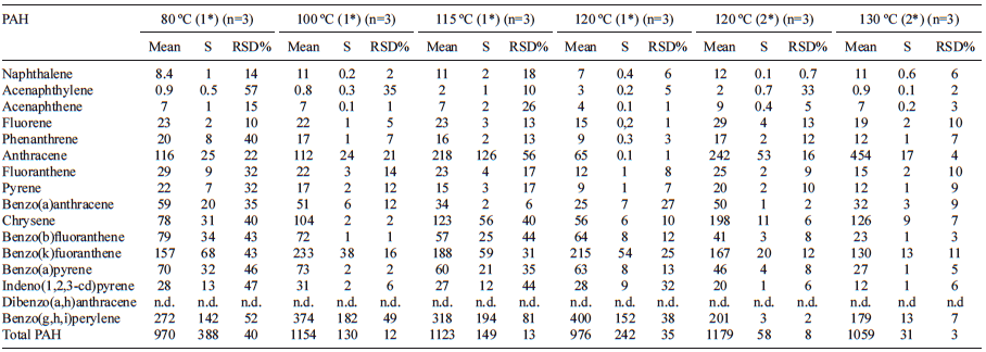 Table II shows the concentrations for the 16 studied PAHs according to the applied temperatures with the exception of dibenzo(a,h)anthracene. As can be seen, for PAHs containing 2-4 aromatic rings, better extraction conditions were obtained by applying the extraction program in two steps at 120* ºC, being 100 ºC the best option for PAHs with 5-7 aromatic rings. In subsequent studies, we selected a temperature of 120* ºC in two steps, as a compromise solution. This temperature allows for the extraction of higher amounts of most PAHs, especially the most volatile ones (with lower molecular mass), which can be found in soils at lower concentrations.