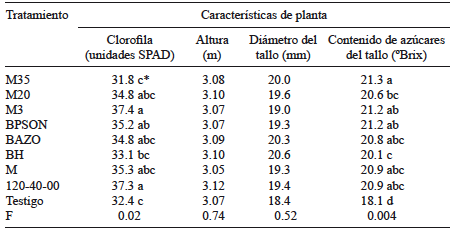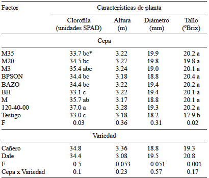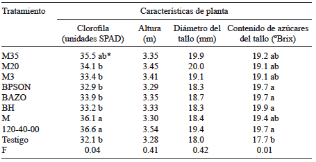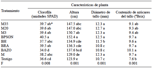 Los resultados indicaron que en todas las variables medidas las cepas microbianas inoculadas tuvieron un efecto benéfico, y que en la mayoría de los casos superaron los valores de las plantas testigo. En cuanto a características de planta, con la cepa BPSON se alcanzó mayor altura y acumulación de clorofila, con 152.4 cm y 40.5 unidades SPAD de índice de clorofila, respectivamente; el mayor diámetro de tallo se registró con M35, M20, M3, BPSON y M. Con relación al contenido de azúcares en tallo, la mayoría de las cepas superaron al testigo (p = 0.001) (Cuadro I).