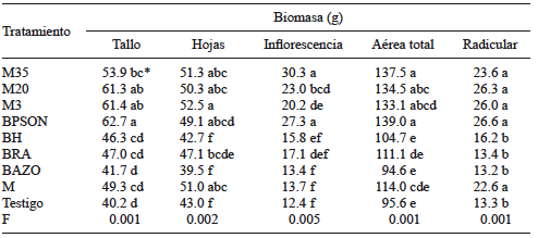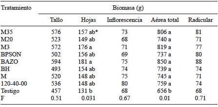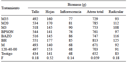 En las variables de biomasa se observaron efectos significativos entre tratamientos para hojas (p = 0.031) y biomasa aérea total (p = 0.01). Los tratamientos con las cepas M3 y BAZO registraron la mayor biomasa de hojas, ambas con promedio de 178.5 g. Con relación a la biomasa aérea total todos los tratamientos superaron, de forma similar, al testigo absoluto (Cuadro IV).