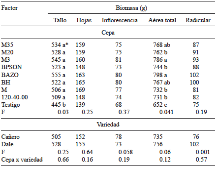 En las variables de biomasa de planta se observaron diferencias significativas para la biomasa del tallo (p = 0.03) y aérea total (p = 0.04). Todos los tratamientos superaron al testigo con relación a la biomasa de tallo y las cepas M3 y BAZO produjeron los mayores valores para la biomasa aérea total. Entre las variedades, Dale superó a Cañero (p = 0.001) con diferencia de 26 g en cuanto a biomasa radicular. En otras variables, así como en las interacciones, no se observaron diferencias significativas (Cuadro VIII). Se observó una asociación positiva entre el contenido de azúcares del tallo con la biomasa de tallo (r = 0.67) y con la biomasa aérea total (r = 0.59).