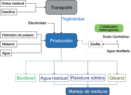 Como una alternativa al catalizador homogéneo actualmente utilizado (KOH), basado en una zeolita natural, la finalidad es mejorar aspectos del proceso, tales como la facilidad de separación del biodiésel y la glicerina. También se espera una disminución en la generación de agua residual y de residuos sólidos. En la figura 2 se presenta un esquema del proceso bajo estudio.