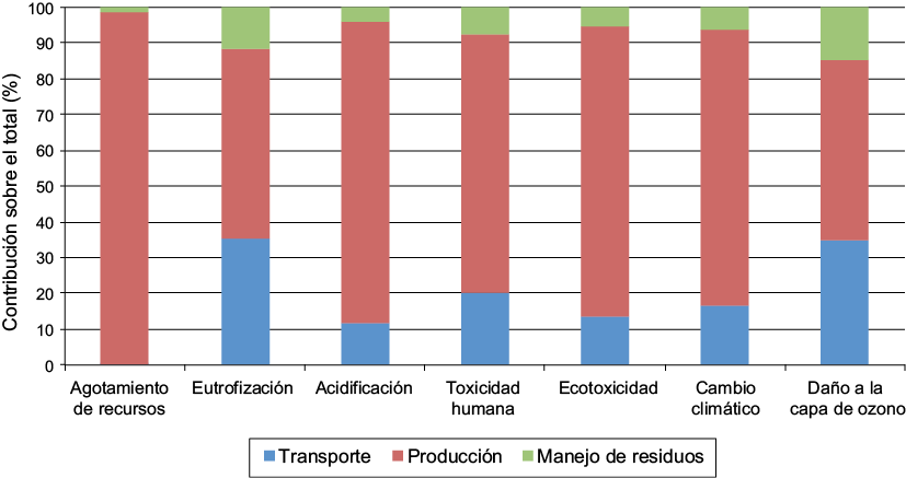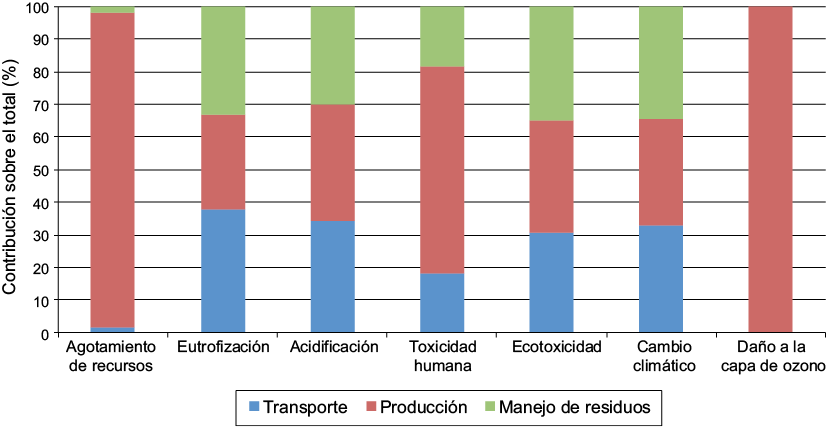 Asimismo, la etapa de transporte contribuye con más de 30 % en el potencial de daño a la capa de ozono y eutrofización, con menos de 20 % en las categorías de acidificación del agua, toxicidad humana, ecotoxicidad y cambio climático. La razón de esta situación es el uso de combustibles fósiles, los cuales generan emisiones al aire, agua y suelo. Por su parte, la etapa de manejo de residuos es la que menos contribuye al impacto en todas las categorías, lo cual es una consecuencia del transporte a los sitios de disposición y a la neutralización de los residuos.
