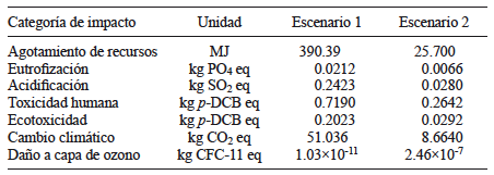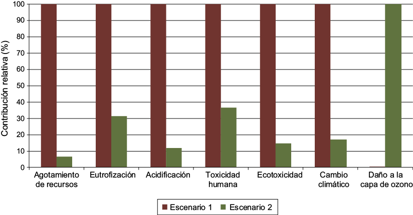 Finalmente, en la figura 5 se muestra una comparación de los dos escenarios. En cada categoría se tomó el máximo valor como el 100 %, los porcentajes para los otros escenarios se calcularon en función de este valor máximo. Se observa que el escenario 1 tiene el mayor impacto en las primeras seis categorías. Existe una disminución notable en el escenario 2.