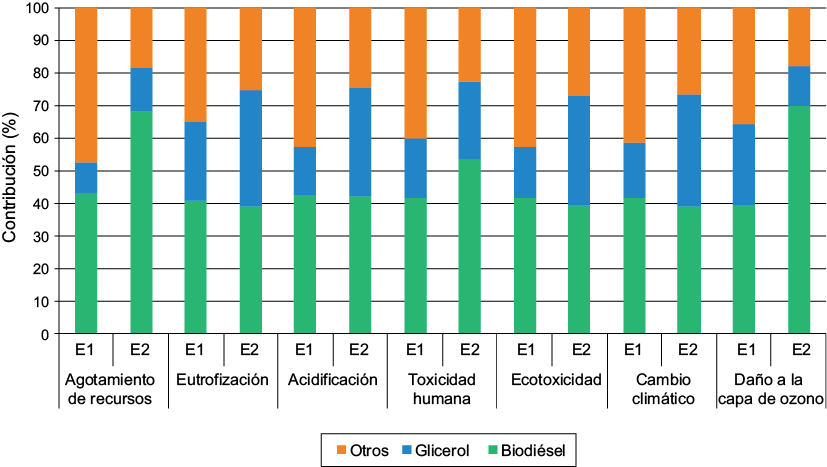 Para el escenario 1, alrededor de 40 % corresponde al biodiésel en todas las categorías evaluadas. Esto se debe a que la asignación de impactos se realizó mediante un método físico considerando la masa de los diferentes flujos. Asimismo, el biodiésel se obtiene en la etapa que presenta los mayores impactos ambientales. Por otro lado, el glicerol es el subproducto con menor asignación de impactos debido a que presenta la menor cantidad de masa respecto a los otros productos.