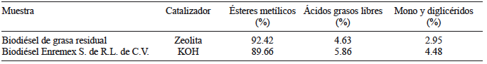En el cuadro I se muestran los resultados del análisis químico del biodiésel obtenido con el catalizador heterogéneo en laboratorio y del biodiésel producido por Enremex S. de R.L. de C.V. Como puede apreciarse, la cantidad de ésteres metílicos es superior en el biodiésel obtenido con la zeolita. De la misma manera, la cantidad de ácidos grasos libres sin reaccionar es menor para el caso del catalizador heterogéneo, lo mismo que los mono y diglicéridos presentes en el producto final.