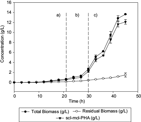 Loo and Sudesh (2007) suggested that concentrations of NH4Cl lower than 0.5 and 5 g/L of palm kernel oil promote the production of 87 % w/w of PHA. During the PHA biosynthesis, it was observed that intracellular production of the polymer is favored as the concentration of Hw decreases in the reactor (Fig. 2c). In our work, the amount of synthesized sclmcl-PHA obtained after 45 h during the third stage of the fed-batch culture, corresponds to 65.3 % w/w of the total biomass generated (13.64 g/L).