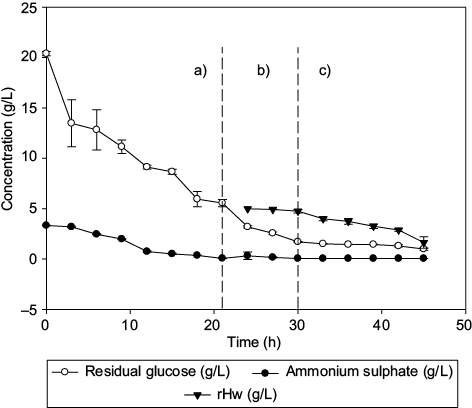 Dry weight (X) was determined by gravimetry, defining residual biomass (rX) as the concentration of X without PHA (Budde et al. 2011). Glucose concentration was determined by the DNS method (Barbosa et al. 2005). Quantification of ammonium sulphate was carried out with the Weatherburn method (López-Cuéllar et al. 2011). The amount of residual beeswax hydrolysates (rHw) was defined as the concentration of recovered Hw, subtracting the centrifuged sample concentration determined by the modified equation described by Budde et al. (2011):