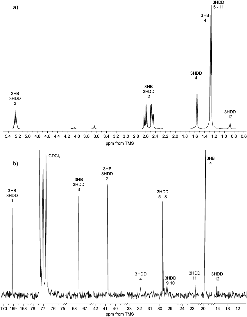 The remaining signals of the methylene groups of the aliphatic chain suggest the presence of 3HD monomer, observed between 22 and 35 ppm (López-Cuéllar et al. 2011). Liu et al. (2011) reported the chemical shift of C-5 to 3-hydroxydodecanoate (3HDD) in 32 ppm; in this study, it was observed at 29.7 ppm, confirming the presence of 3-hydroxydecanoate (3HD) together with other monomers of mcl-PHA that do not appear in the 13C NMR spectra. By 1H NMR spectra, performing the integration of signals of the methyl, methylene and methine groups it was determined that the mclPHA monomers were in a proportion of 4.6 mol % over the 3HB. The monomer composition of the esters of fatty acids obtained in the mcl-PHA are consistent with those reported for biodegradable plastics.