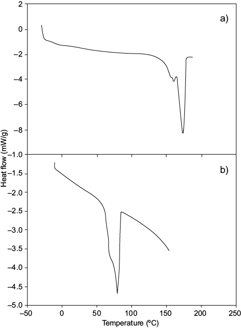 DSC for the obtained scl-mcl-PHA (Fig. 4b) showed an endothermic transition at 79.8 ºC with a DHm of 45.6 J/g. This δHm is similar to that reported by López-Cuéllar et al. (2011) (δHm 41.44 J/g) for a mcl-PHA with 3HV, 3HO, 3HDD and 3HB monomers. Liu et al. (2011) obtained a PHA with 3HD monomers using a strain of Pseudomonasputida KTQQ20 inhibiting the β-oxidation, which consumed decanoic, dodecanoic, and tetradecanoic acids.