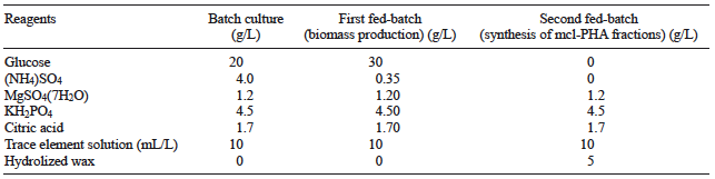 C. necator ATCC 17699 was propagated in Luria Bertani broth (LB) and incubated at 30 ºC. The inoculum for all assays was prepared by transferring 100 mL of seed flask cultivation with LB medium, incubated for 36 h at 150 rpm and 30 ºC on a rotary shaker (Excella E24, New Brunswick Scientific). The fermentation medium of stage 1 (batch culture), first fed-batch culture in stage 2 (biomass production), and second fed-batch culture in stage 3 are described in table I (synthesis of mcl-PHA fractions). The trace element solution was defined by Shang et al. (2004).