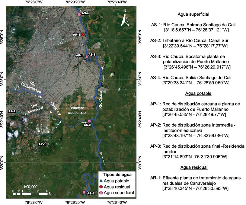 El CUA fue monitoreado en ocho puntos (Fig.1): en el agua superficial se tomaron tres puntos sobre el río Cauca: a la entrada de la ciudad (AS-1), en la bocatoma de la PTAP-PM (AS-3) y a la salida de la ciudad (AS-4). Además de un tributario del río llamado Canal Sur (AS-2) que recoge los ríos Cañaveralejo, Melendez y Lili, así como efluentes de aguas residuales sin tratar y lixiviados de un antiguo botadero de la ciudad que se encuentra sellado y clausurado.