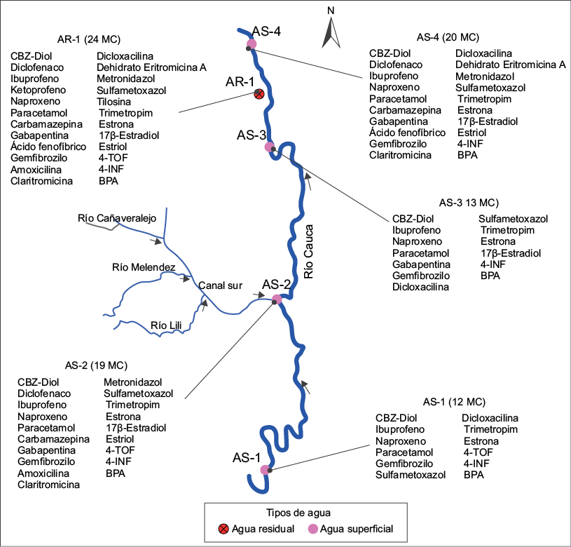 En AS-1, el río contiene 12 MC, posiblemente asociado a vertimientos domésticos e industriales aguas arriba. En el siguiente punto sobre el río, en AS-3, la presencia se incrementa a 13 MC siendo la gabapentina y 17β-estradiol los dos nuevos MC, que se infiere fueron aportados por AS-2, mientras que el 4-tert-octilfenol (4-TOF) se redujo a valores menores al LD.
