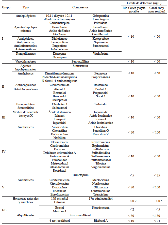 Por concentración y presencia en el CUA de Santiago de Cali se destacan los siguientes compuestos: paracetamol, CBZ-Diol, ibuprofeno, naproxeno, gemfibrozilo, sulfametoxazol, estronas, 4-INF y BPA. El paracetamol fue el que tuvo concentraciones de hasta 10 veces más altas en el agua superficial y residual.