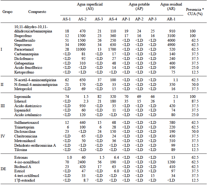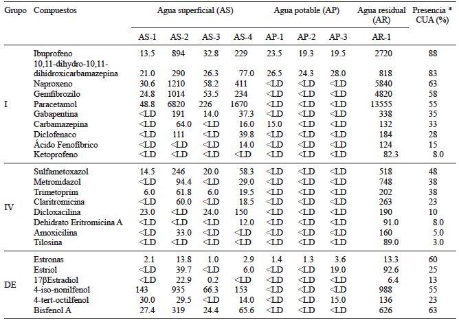 Los MC del grupo I que tuvieron las concentraciones más altas fueron paracetamol, naproxeno, gemfibrozilo e ibuprofeno (hasta 200 veces el LD), del grupo II, n-acetil-4-aminoantipirina y n-formil-4-aminoantipirina (hasta 13 veces el LD). Por su parte, del grupo III, iohexol, iopromida y ácido diatrizoico (hasta 32 veces el LD), del grupo IV, sulfametoxazol, metronidazol y claritromicina (hasta 12 veces el LD) y del grupo DE 4-INF y BPA (hasta 24 veces el LD).