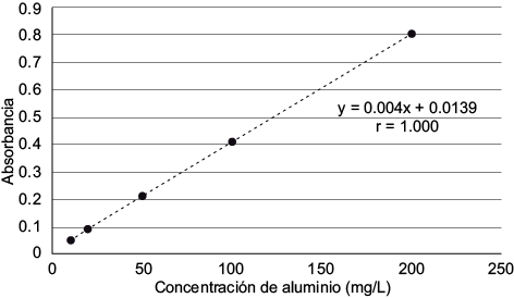 Concentraciones de trabajo. Fueron de 10, 20, 50, 100 y 200 mg/L de Al, las cuales se acondicionaron con HNO3 al 2 % (J.T. Baker) y con KCl al 0.2 % (J.T. Baker) para su cuantificación con EAA-F con óxido nitroso-acetileno. Adicionalmente se prepararon tres curvas de calibración a concentraciones de 20, 40, 60, 80 y 100 μg/L de Al, y se acondicionaron con HNO3 al 2 % y con Mg(NO3)2 al 0.2 % (J.T. Baker) para su cuantificación por EAA-HG.